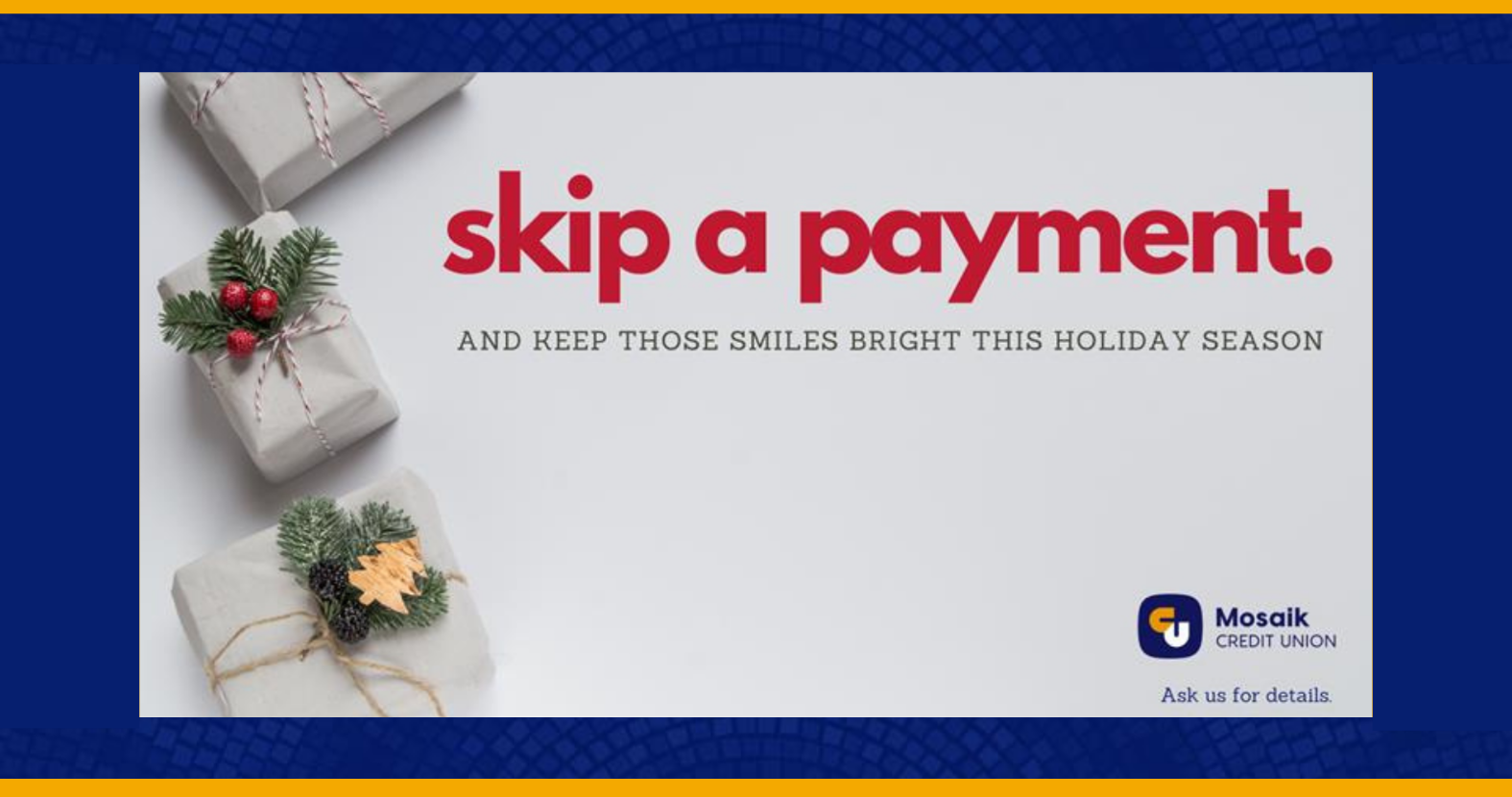 Skip A Payment is active now and we're here to support you and your personal loans in prepping for and getting through the holidays without additional stress. Defer for November/December or December/January! Ask us for details and how to qualify!